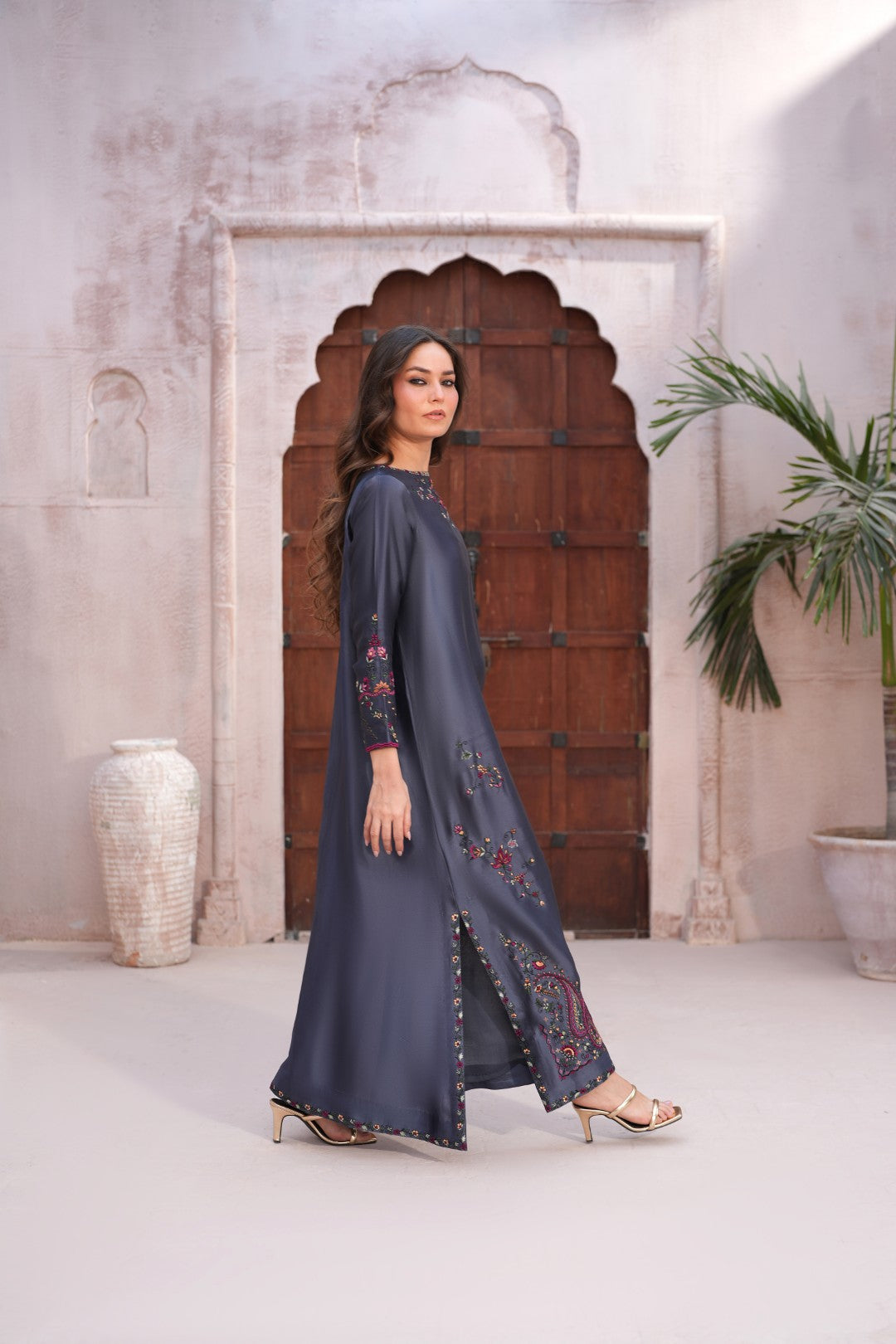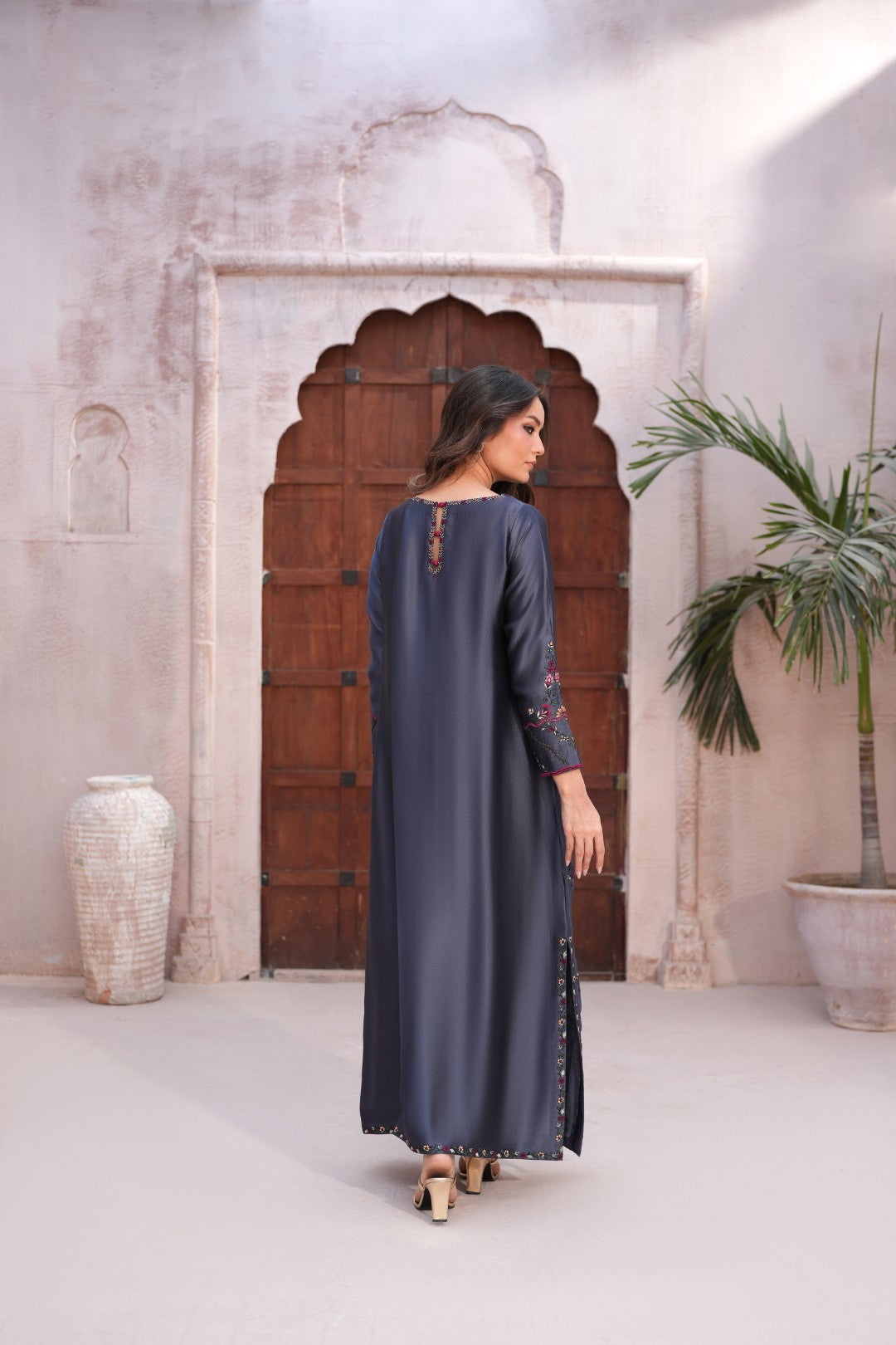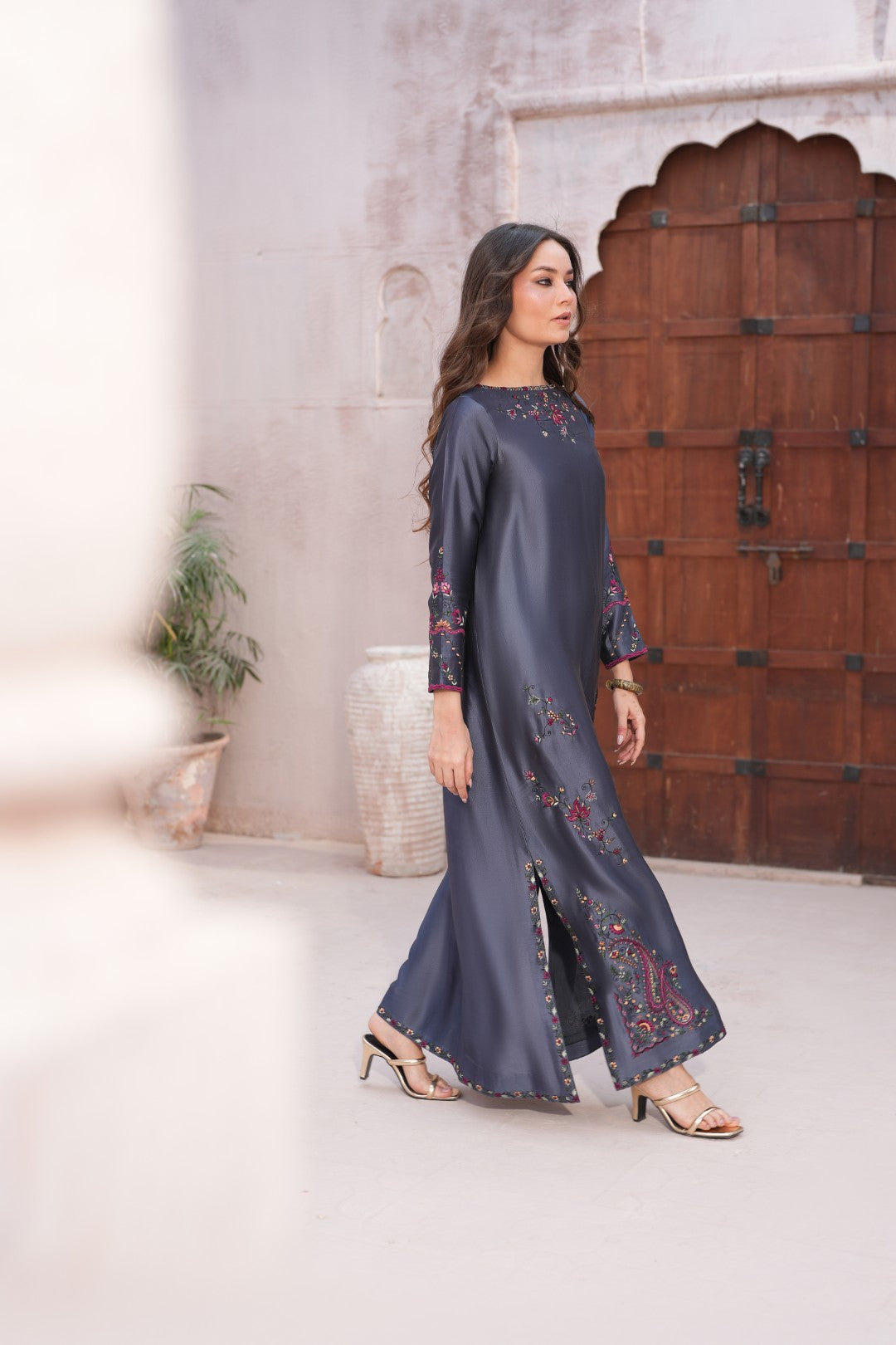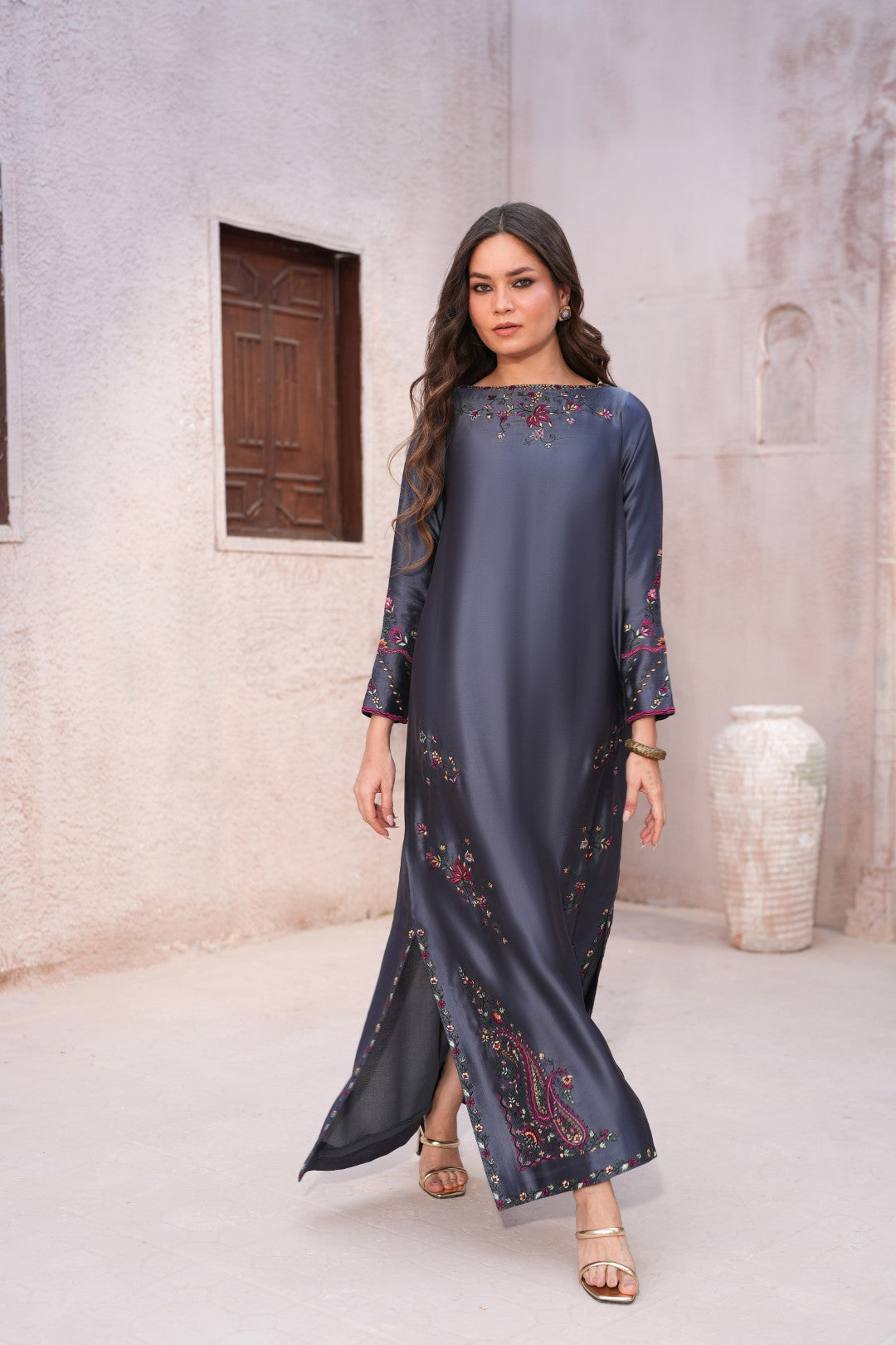From our Araish Eid Collection, this slate-grey silk kaftan is a tribute to the timeless craft of hand-embroidery. Named for "adornment," Araish celebrates the beauty of intricate floral vines and traditional paisley motifs, meticulously placed to create a silhouette of effortless grace. Fabric is pure butter silk.