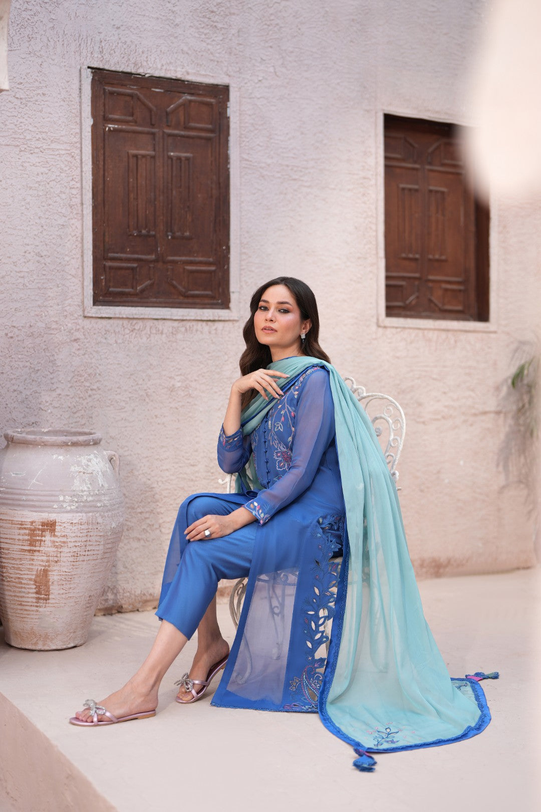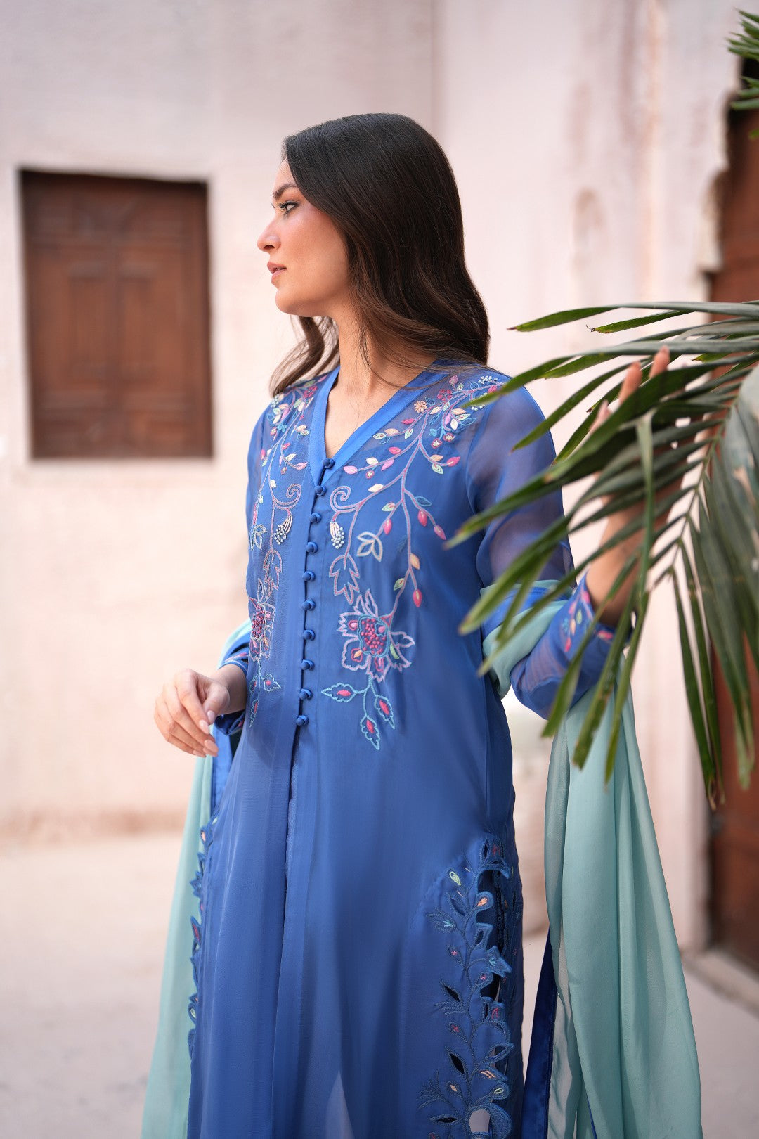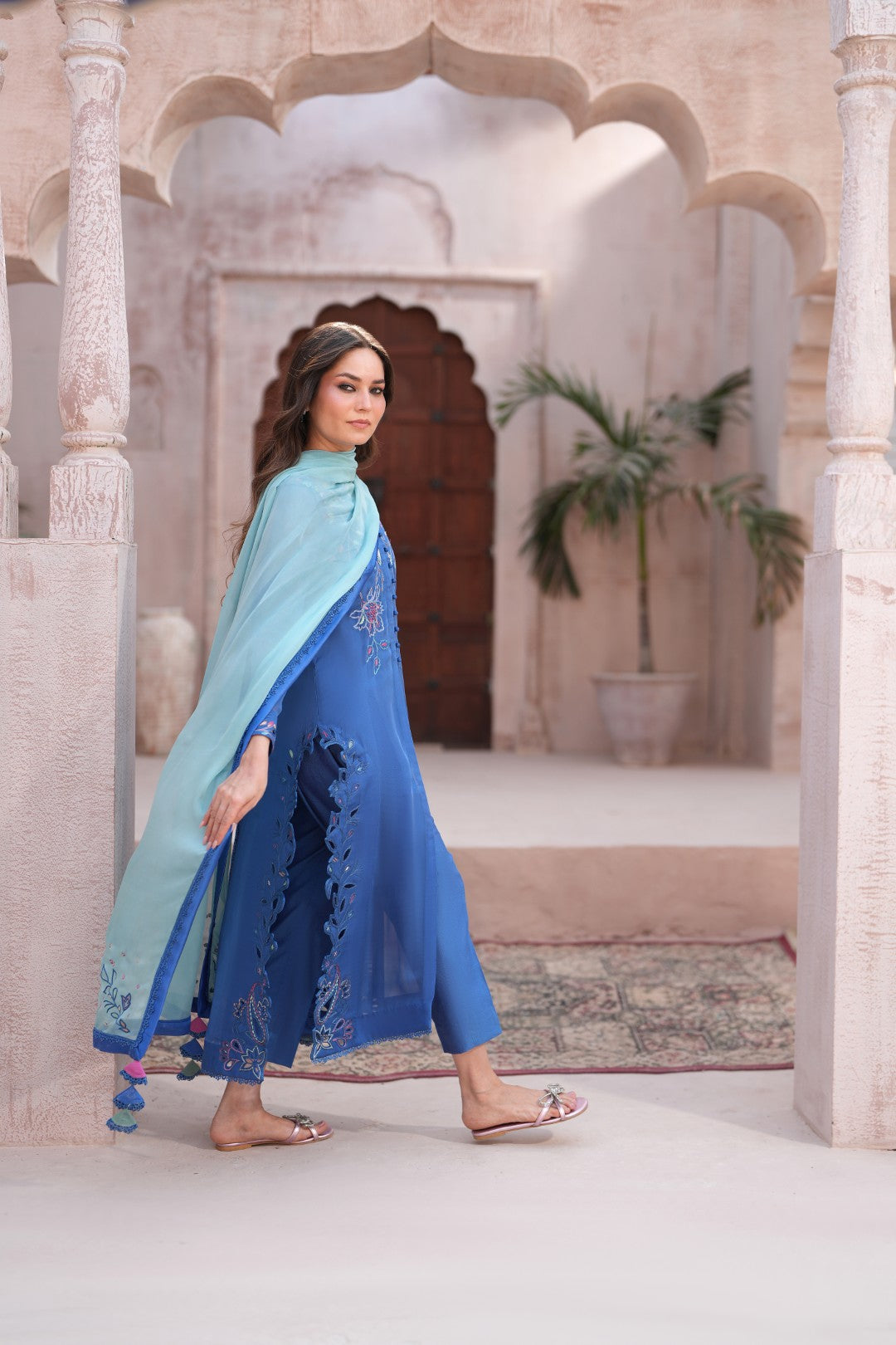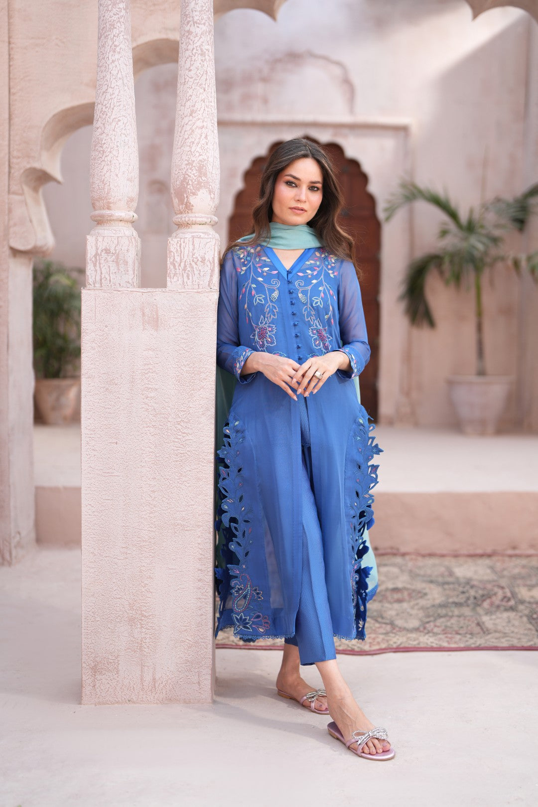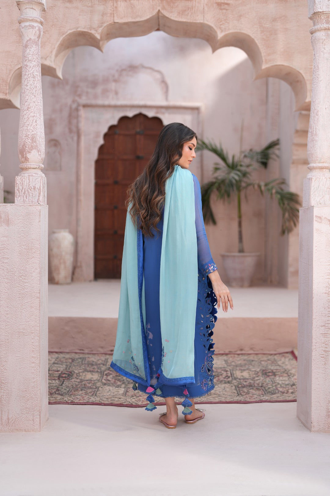 This blue ensemble from the Araish collection is a sophisticated blend of ethereal textures and intricate hand-craftsmanship.