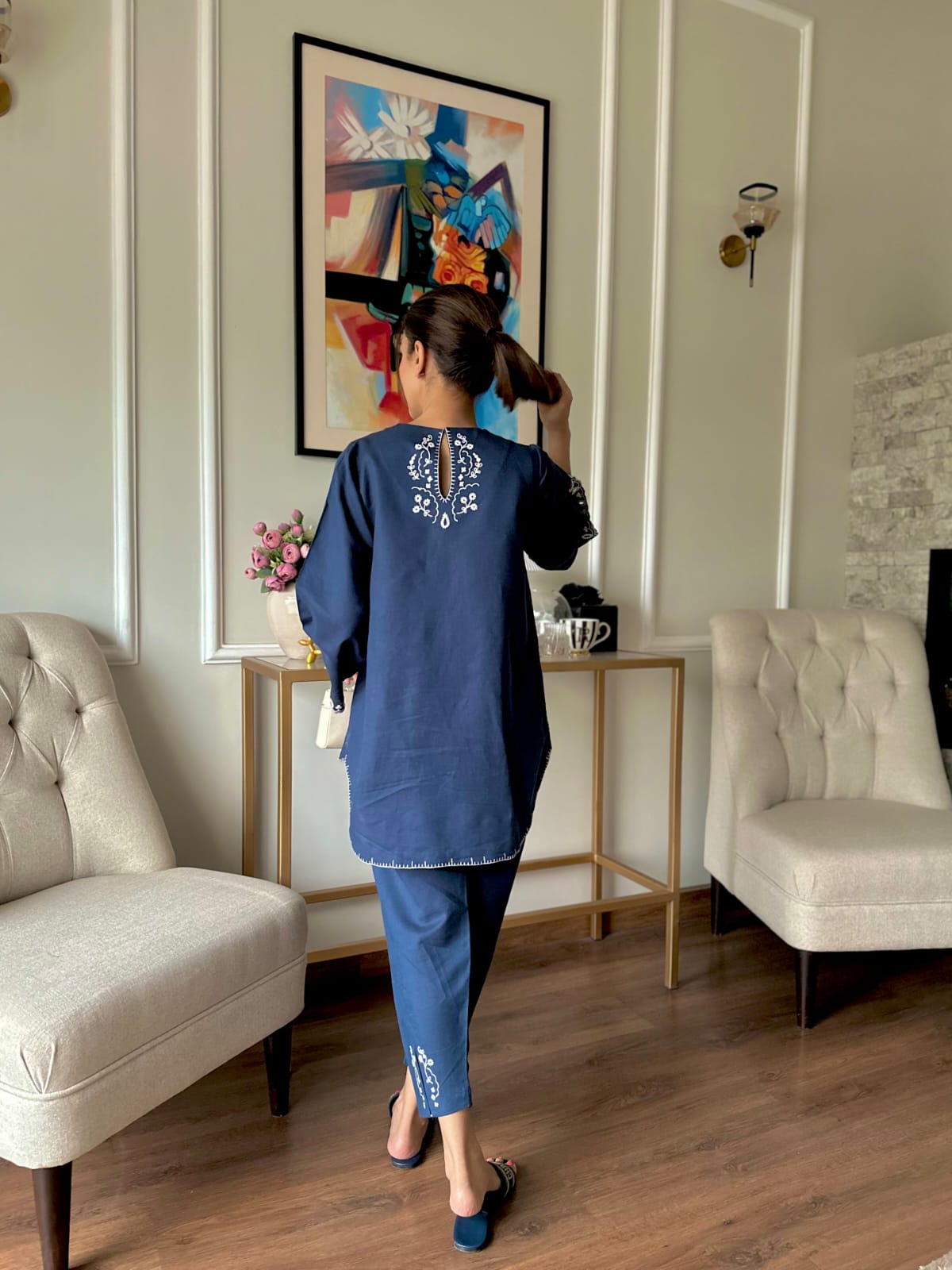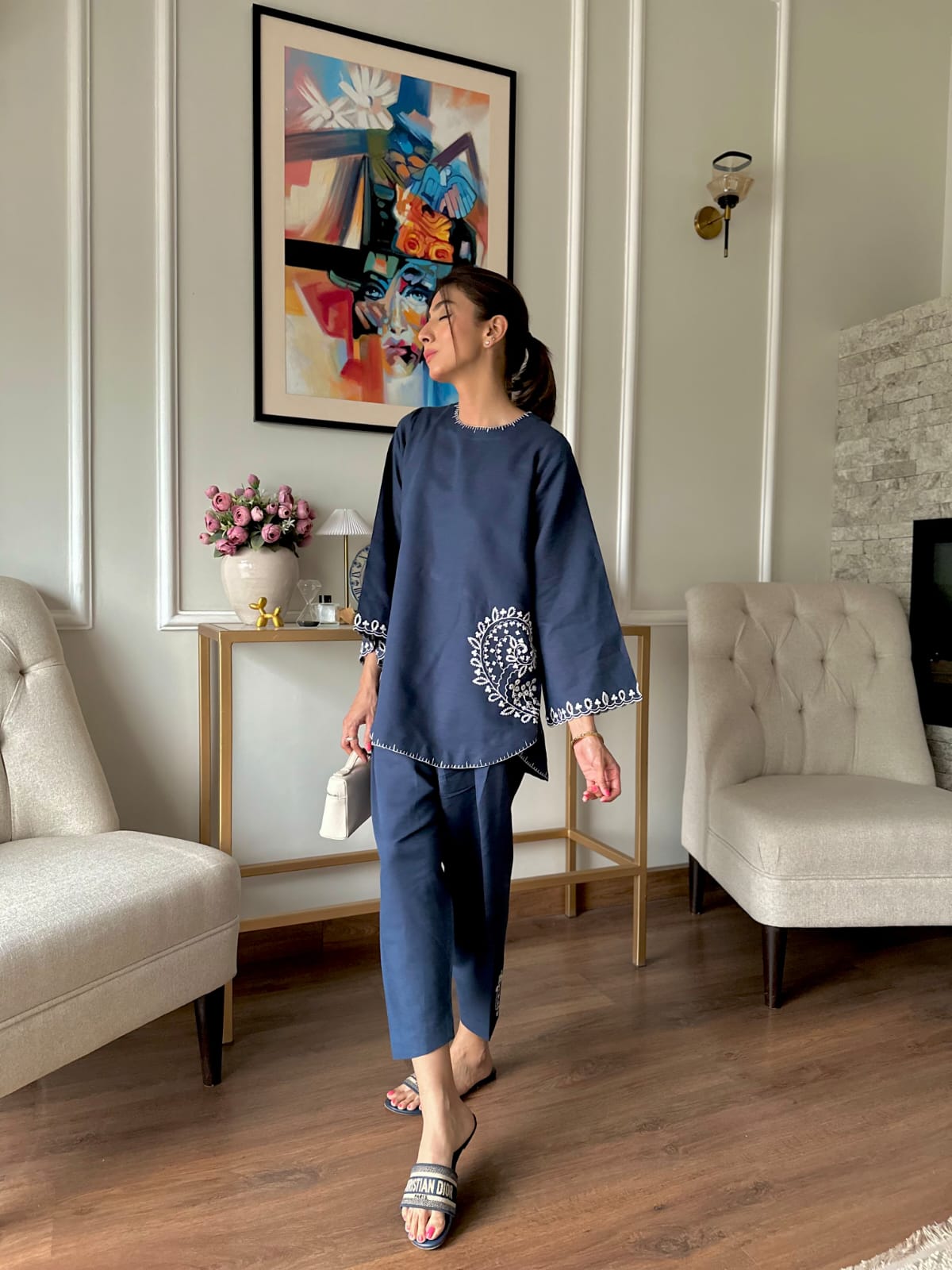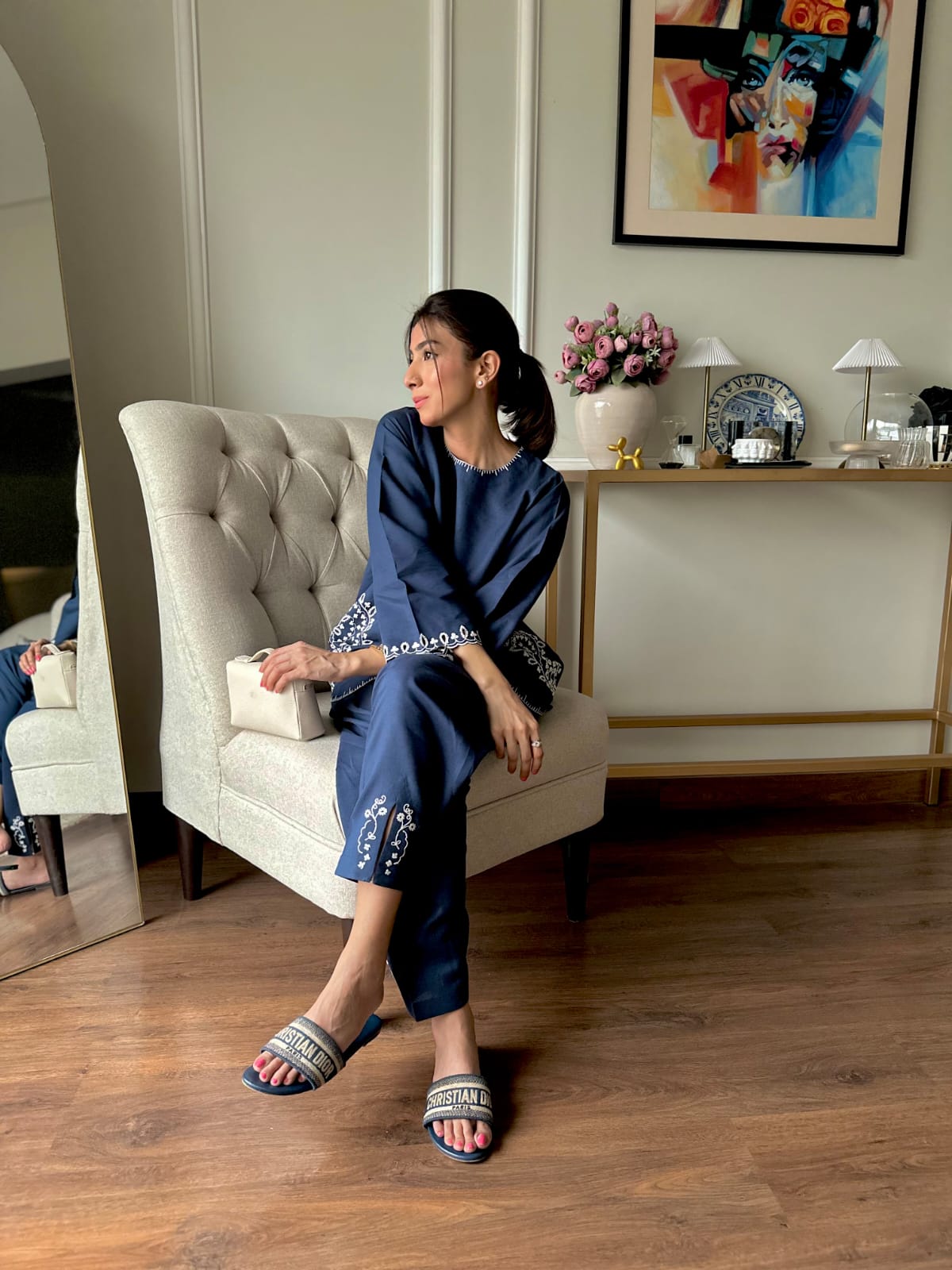 The outfit features a stylish, navy blue ensemble that includes a loose-fitting top and matching pencil shalwar. The top has wide, a-lined sleeves and is adorned with intricate white embroidery along the hem, creating a beautiful contrast. The shalwar is also navy blue, maintaining a cohesive look.